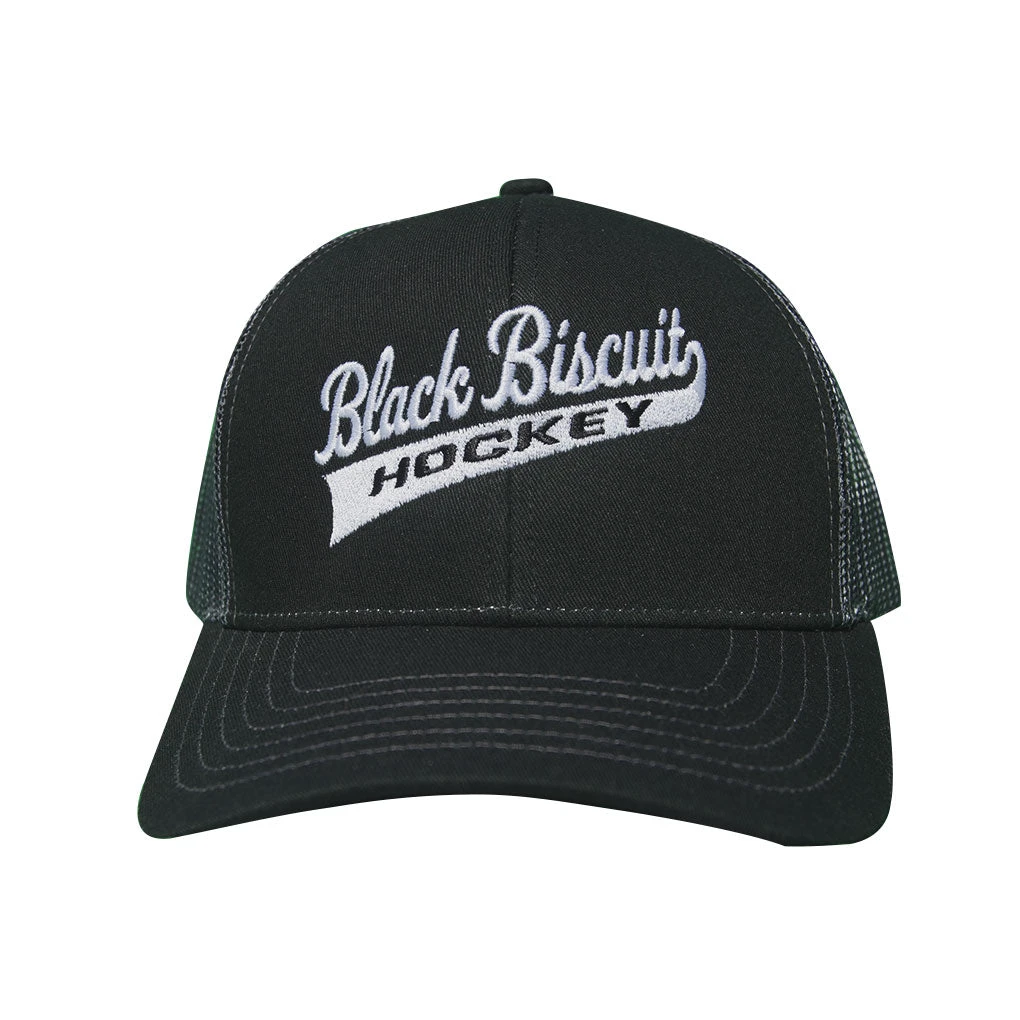 The Black Biscuit Hockey Script Logo Hat is a 6-panel snapback and has a pre-curved visor, mesh back panels, and structured crown.