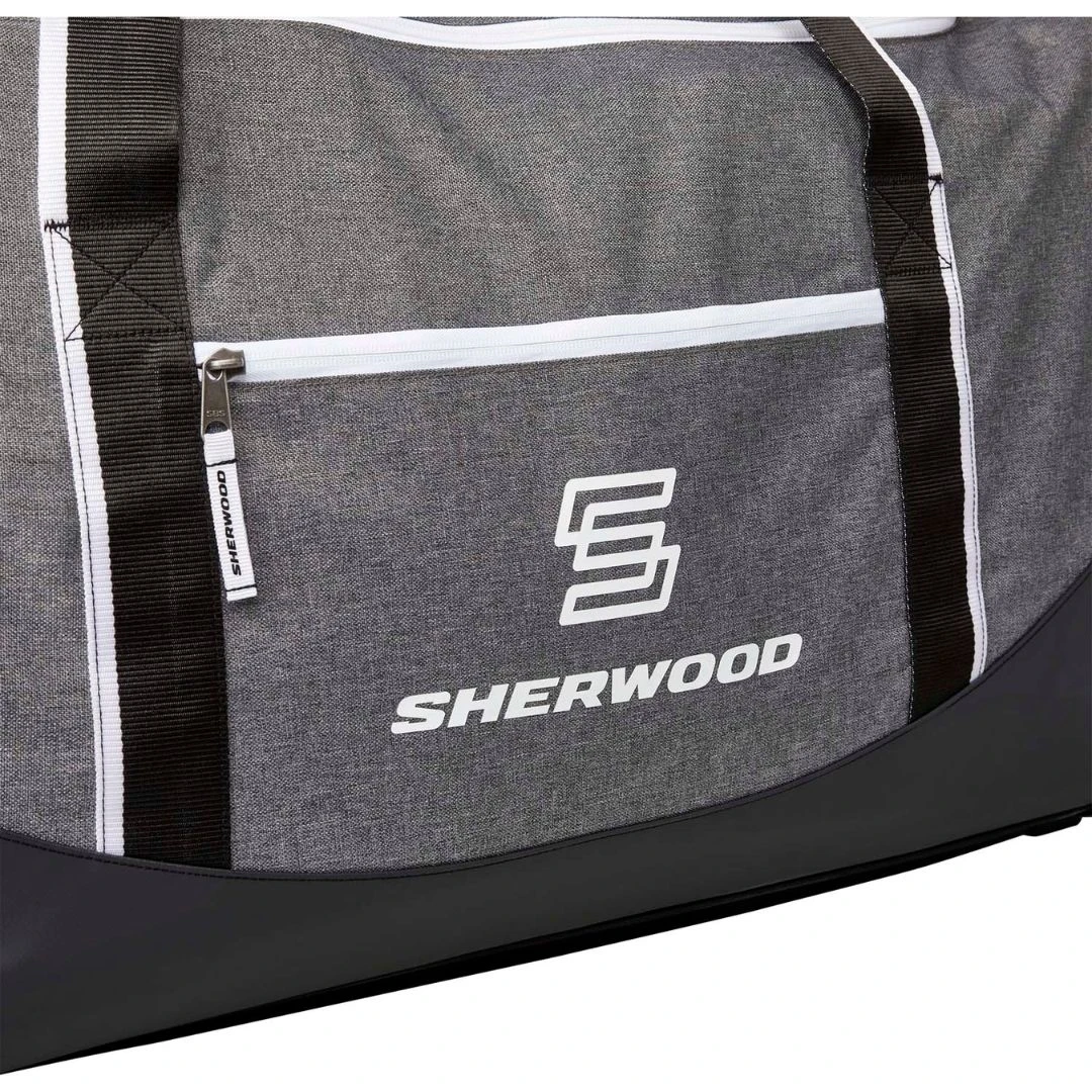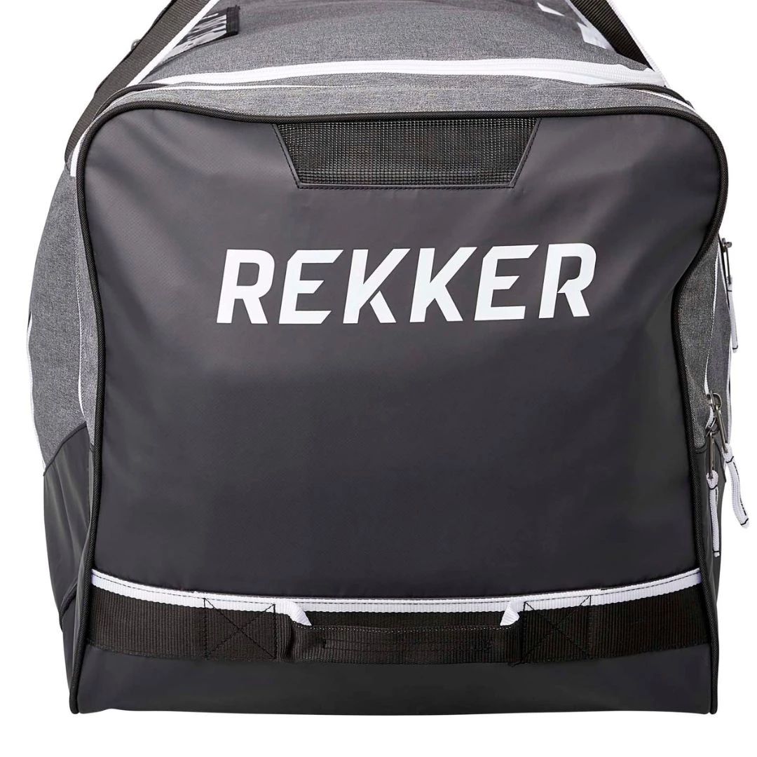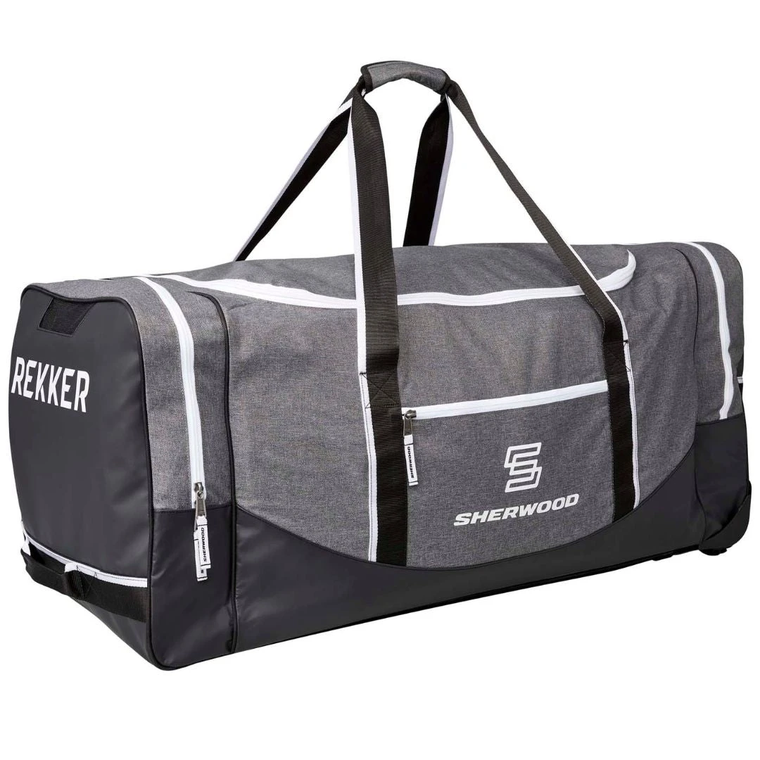 - The Sherwood Rekker Team Wheeled Bag looks great and stores your gear comfortably and safely. Its unique exterior boasts a 600D heathered polyester material that resists rips and tears while adding visual richness to the bag. Water-proof tarpaulin reinforces the base and once again bolsters the overall durability. This model features two all-terrain wheels that make transportation much easier to and from the rink and sturdy bottom skid bars to elevate bag durability and structure.