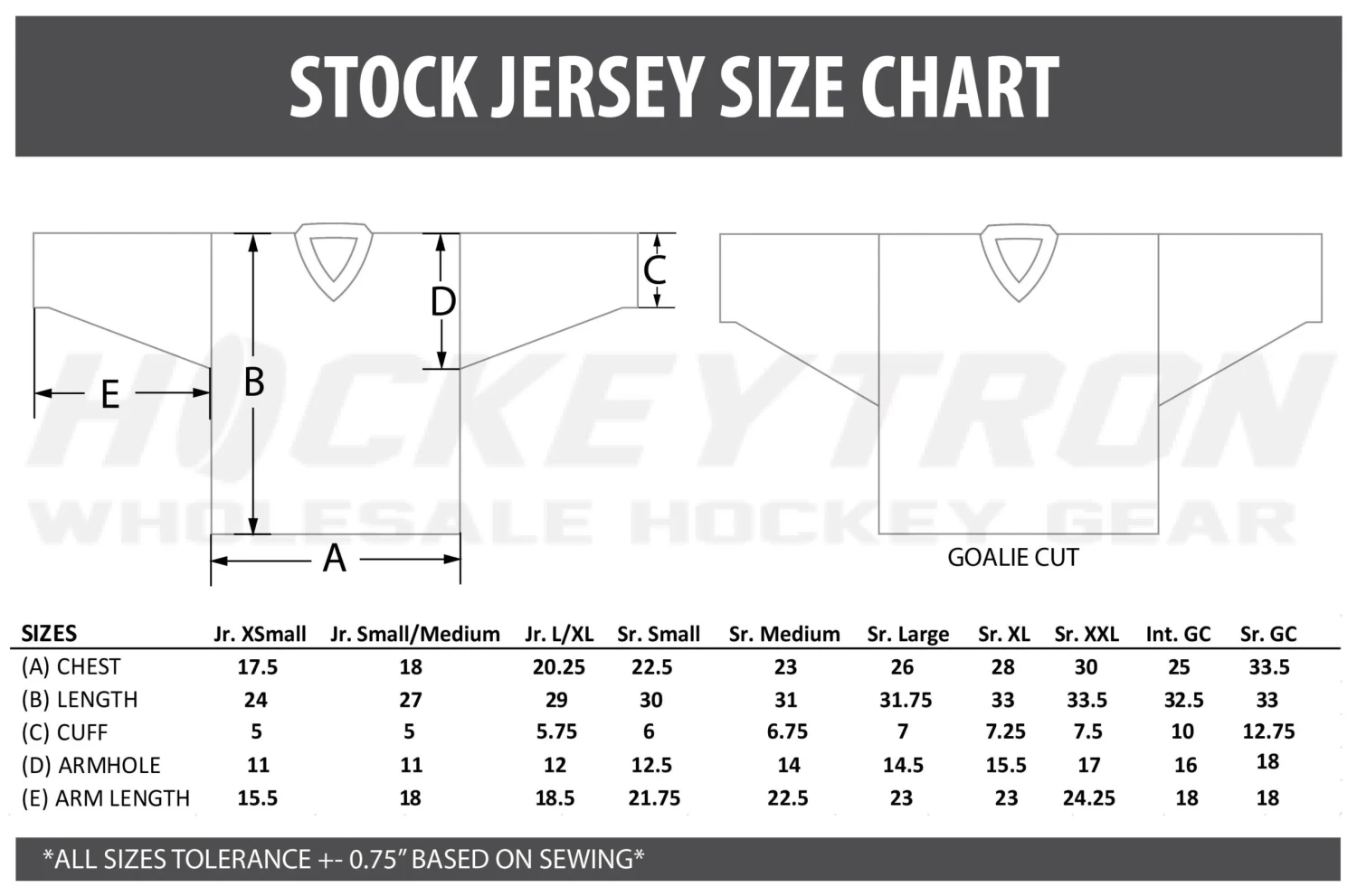 | Size | JR X-Small, JR Small/Medium, JR Large/X-Large, SR Small, SR Medium, SR Large, SR X-Large, SR XX-Large, INT Goalie Cut, SR Goalie Cut |